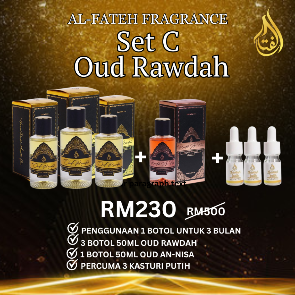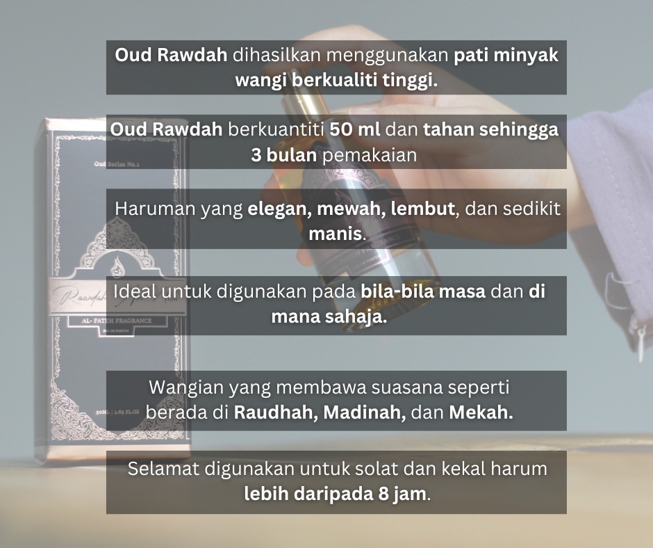 Dengan Oud Al-Fateh, anda dapat merasai ketenangan dan keindahan Raudhah setiap hari. Haruman ini mampu memberi ketenangan jiwa dalam kehidupan harian selain mengubati rindu pada Tanah Suci Makkah & Madinah.
