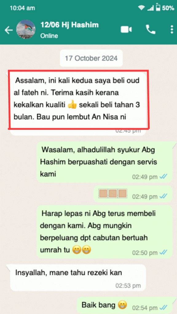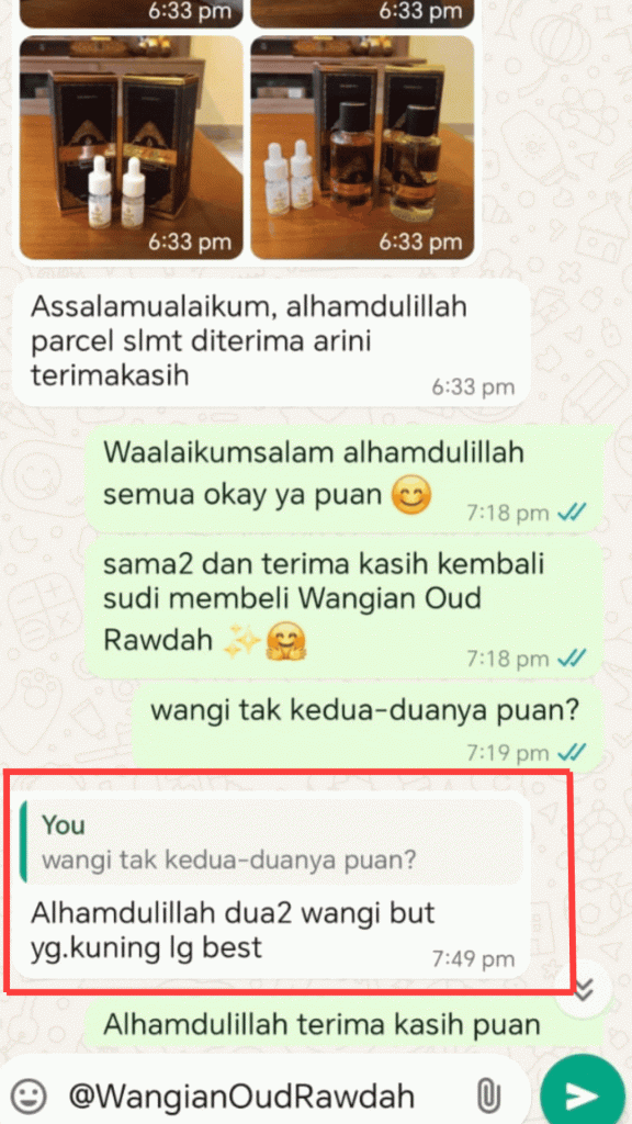 semua pelanggan yang pernah cuba Oud Al-Fateh mesti puas hati dengan aroma serta kualiti wangian kami. Nak bagi hadiah atau buat hantaran pun boleh. Nampak mewah harga berpatutan.