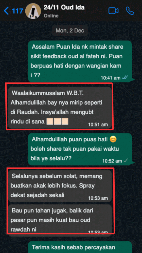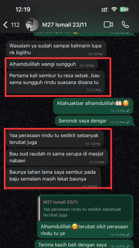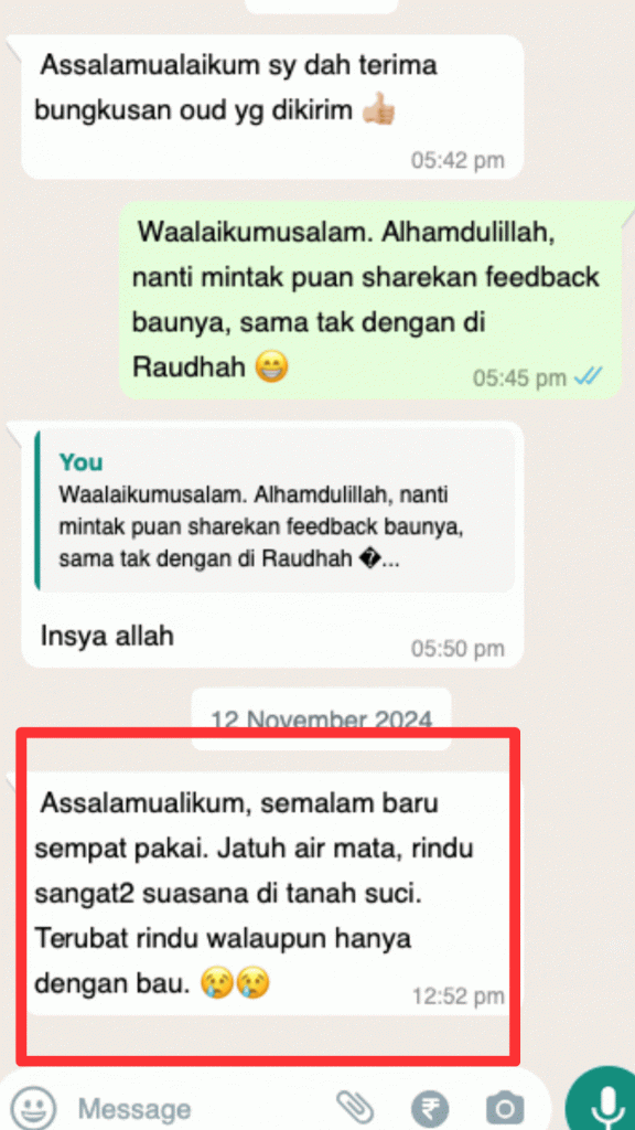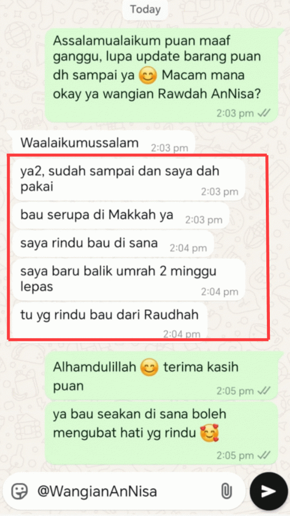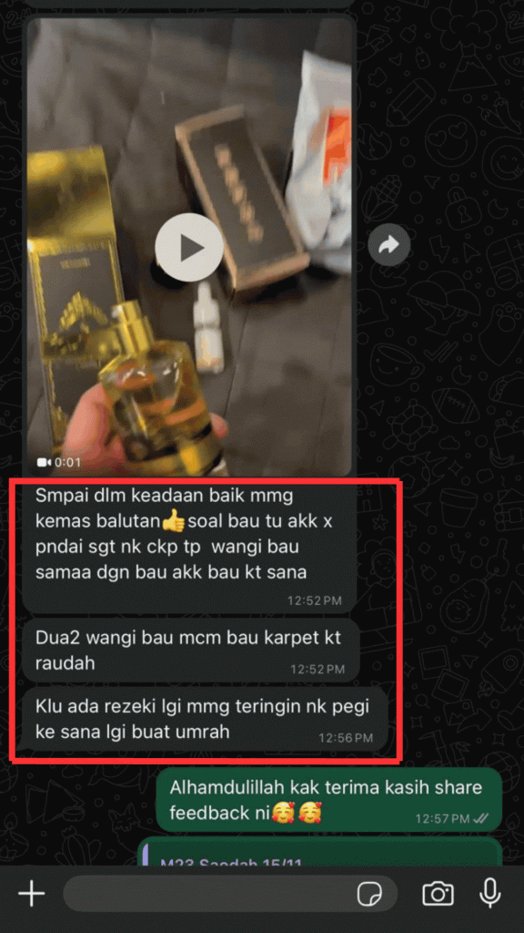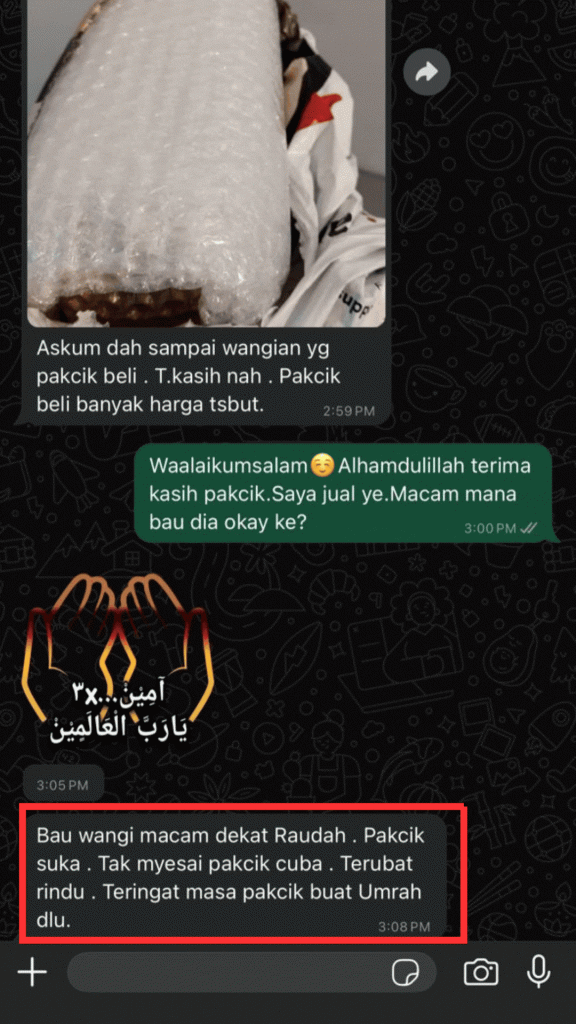 ” Bau dia sama betul macam bau di Raudhah. Rasa tenang je jiwa ni bila pakai wangian ni, terubat rasa rindupada kota suci, bila lah nak dijemput lagi ke sana ” – Hajah Noraini (52)